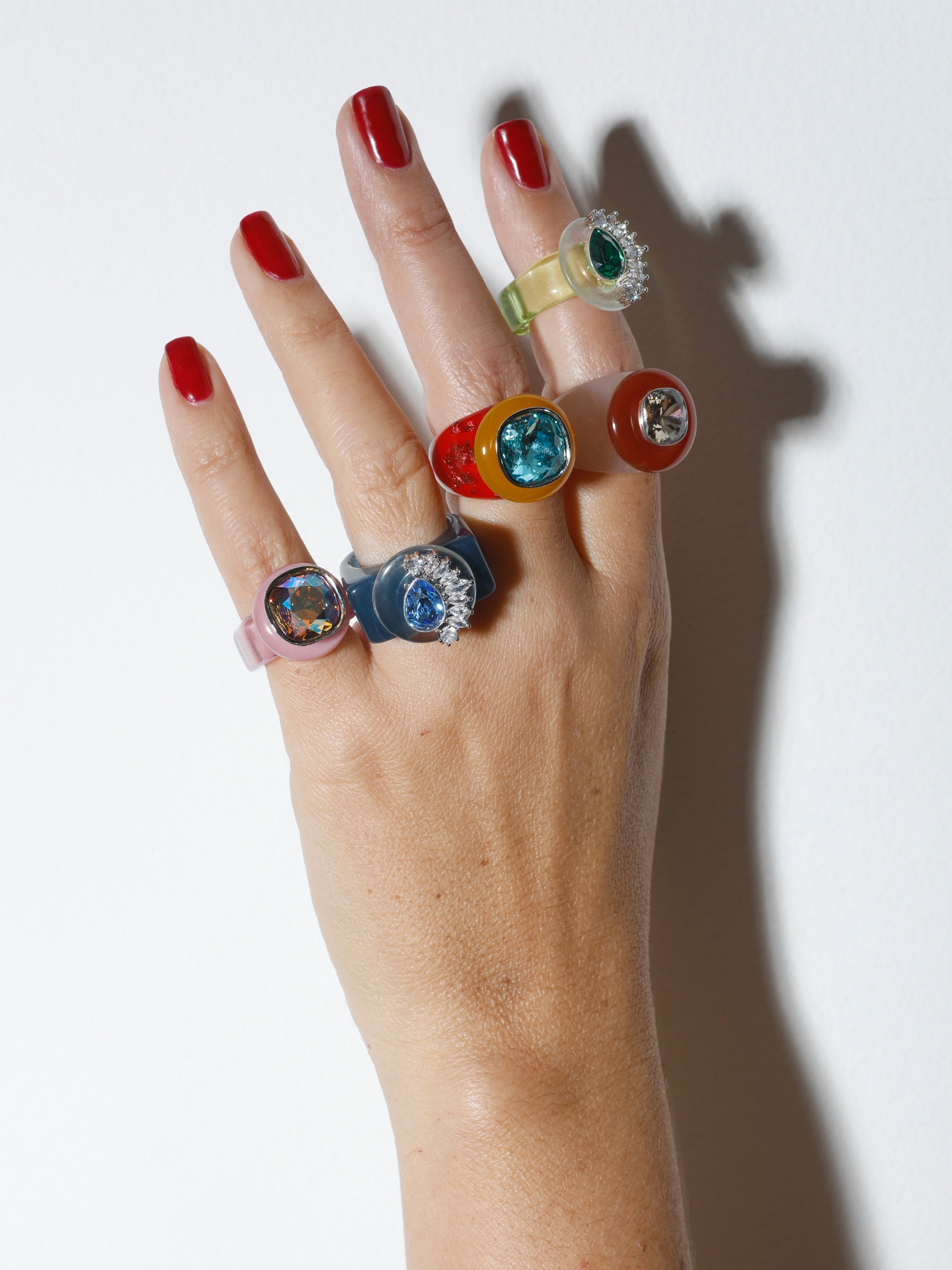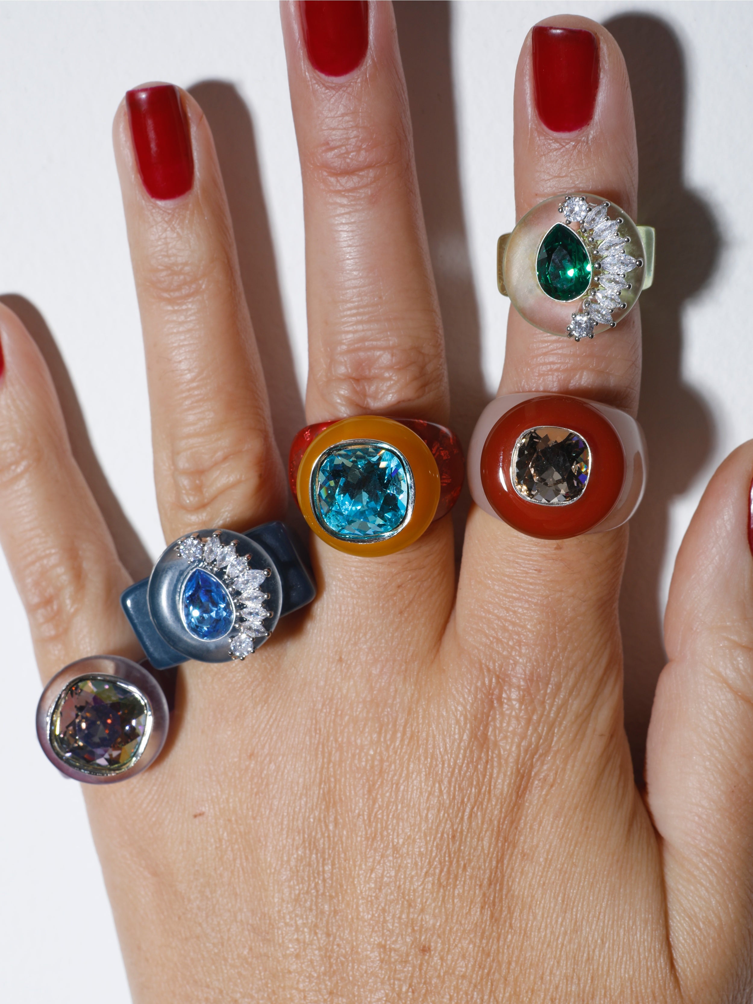 Each ring balances vibrant color with sculptural form while tapping into memory and emotion, foundations of MOUNSER'S signature design philosophy.