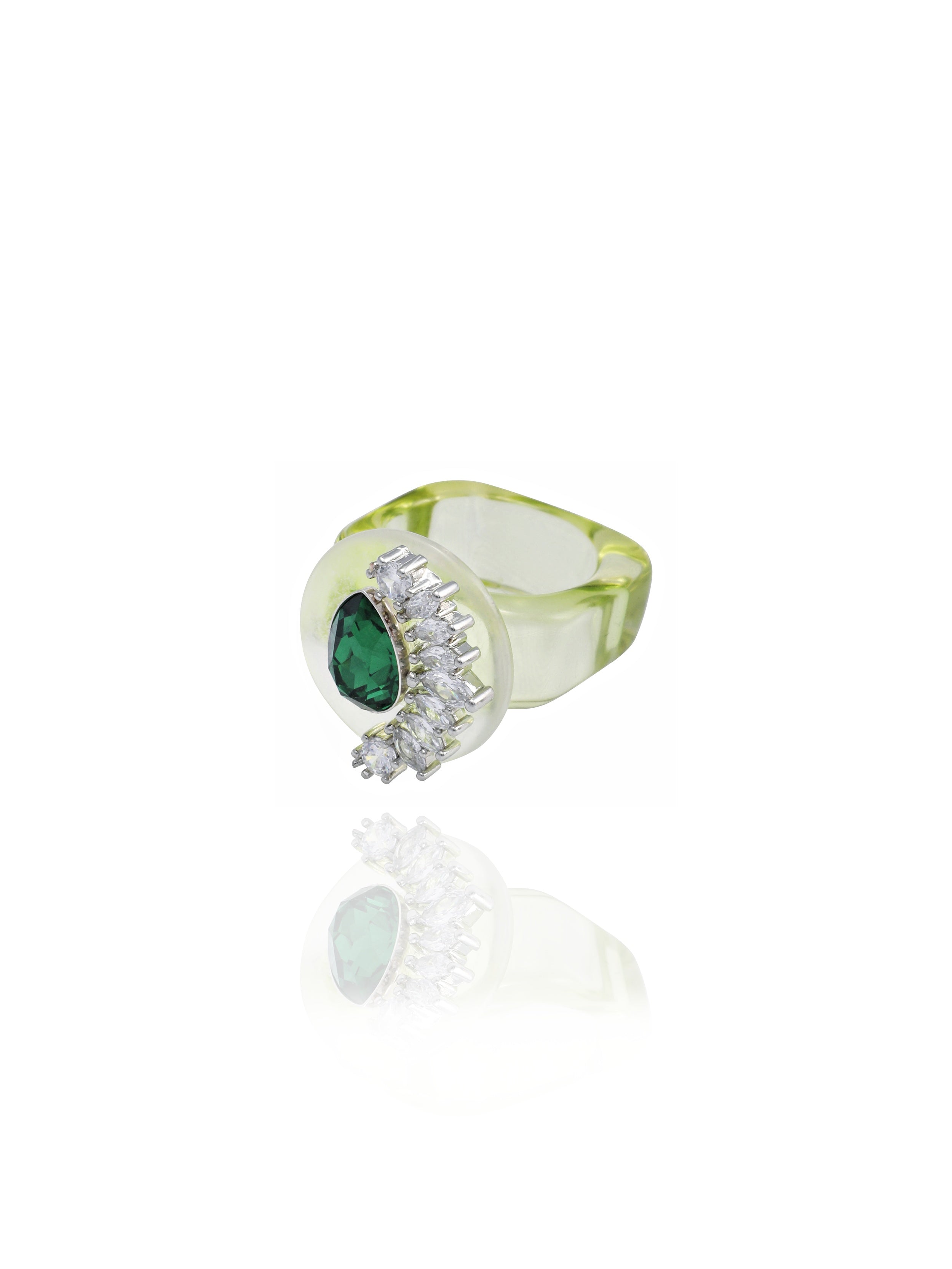 - Green hand-polished acrylic resin ring band with a translucent finish.