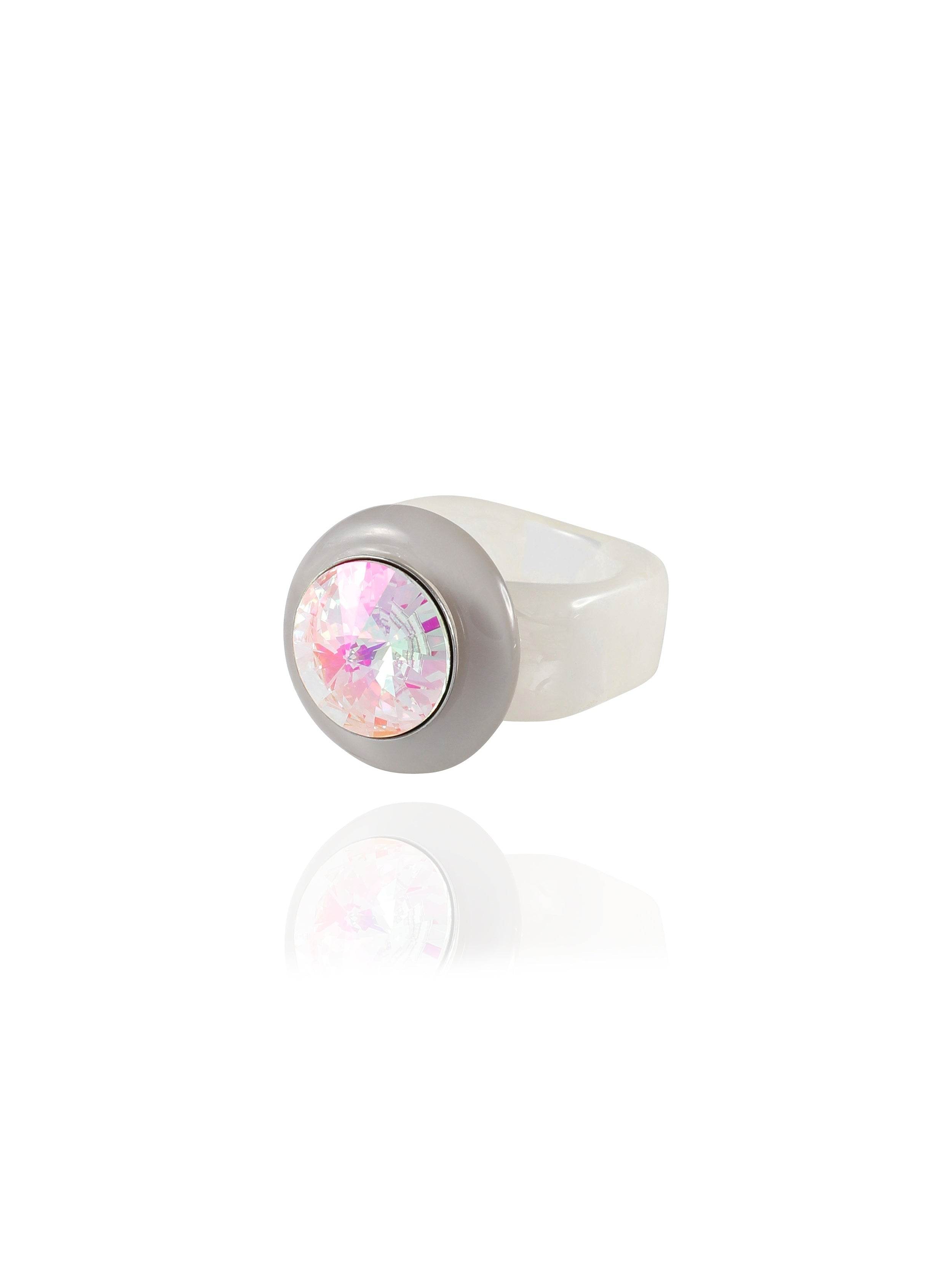 A pinky cocktail ring features a sheer square acrylic band. A round Austrian crystal is set in rhodium plated brass and sits atop a resin halo.