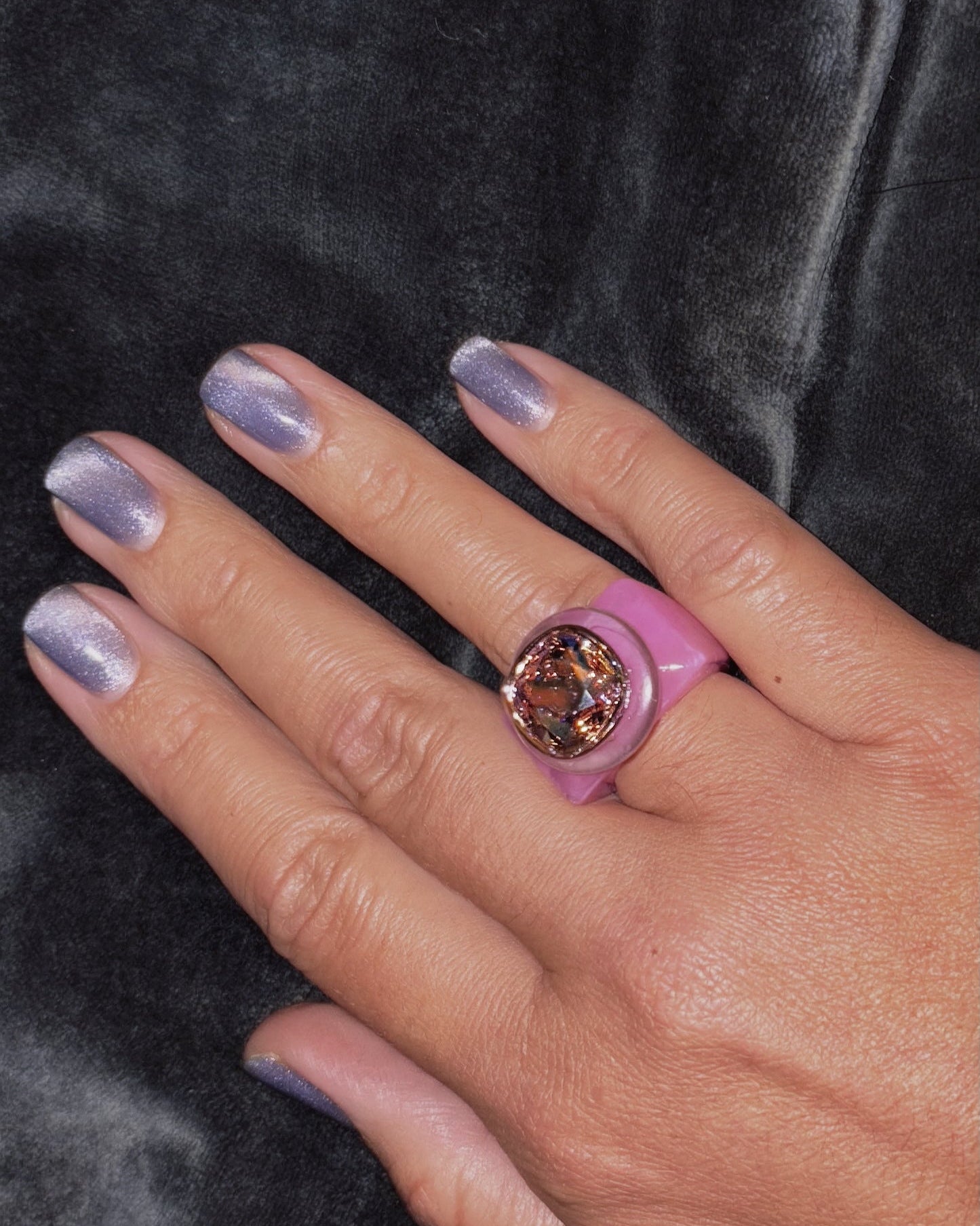 Inspired by rave culture, the Ring Pop Collection was designed to be light-catching and exuberant. Taking shape in sculptural form, the Ring Pop in Bubble Gum features a crystal rhinestone in a candy-saturated iridescent hue on an acrylic resin ring base. High-gloss color is anchored by crystalline brilliance, and each piece transforms a moment of nostalgia into refined adornment.