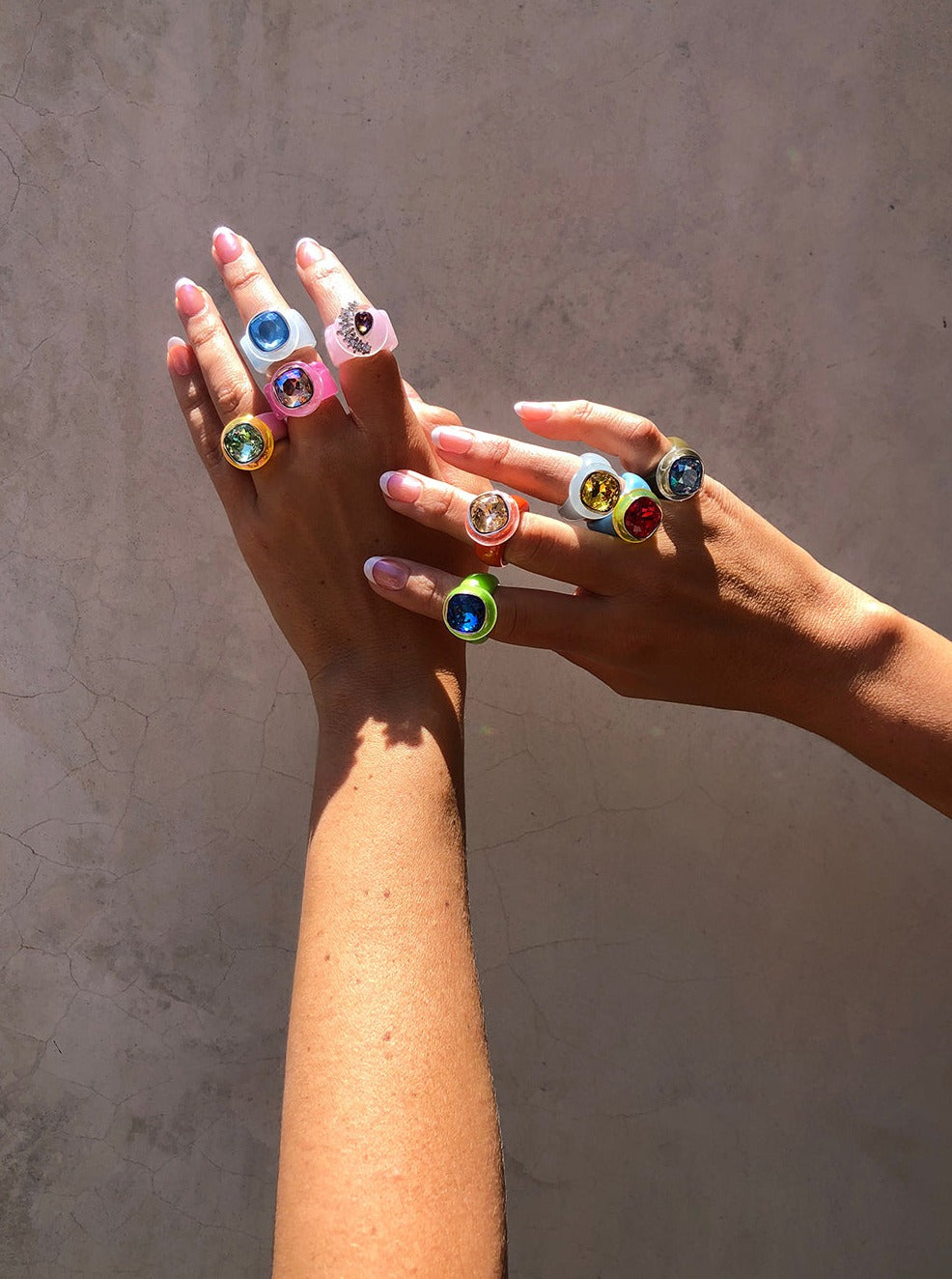 Each ring balances vibrant color with sculptural form while tapping into memory and emotion, foundations of MOUNSER'S signature design philosophy.