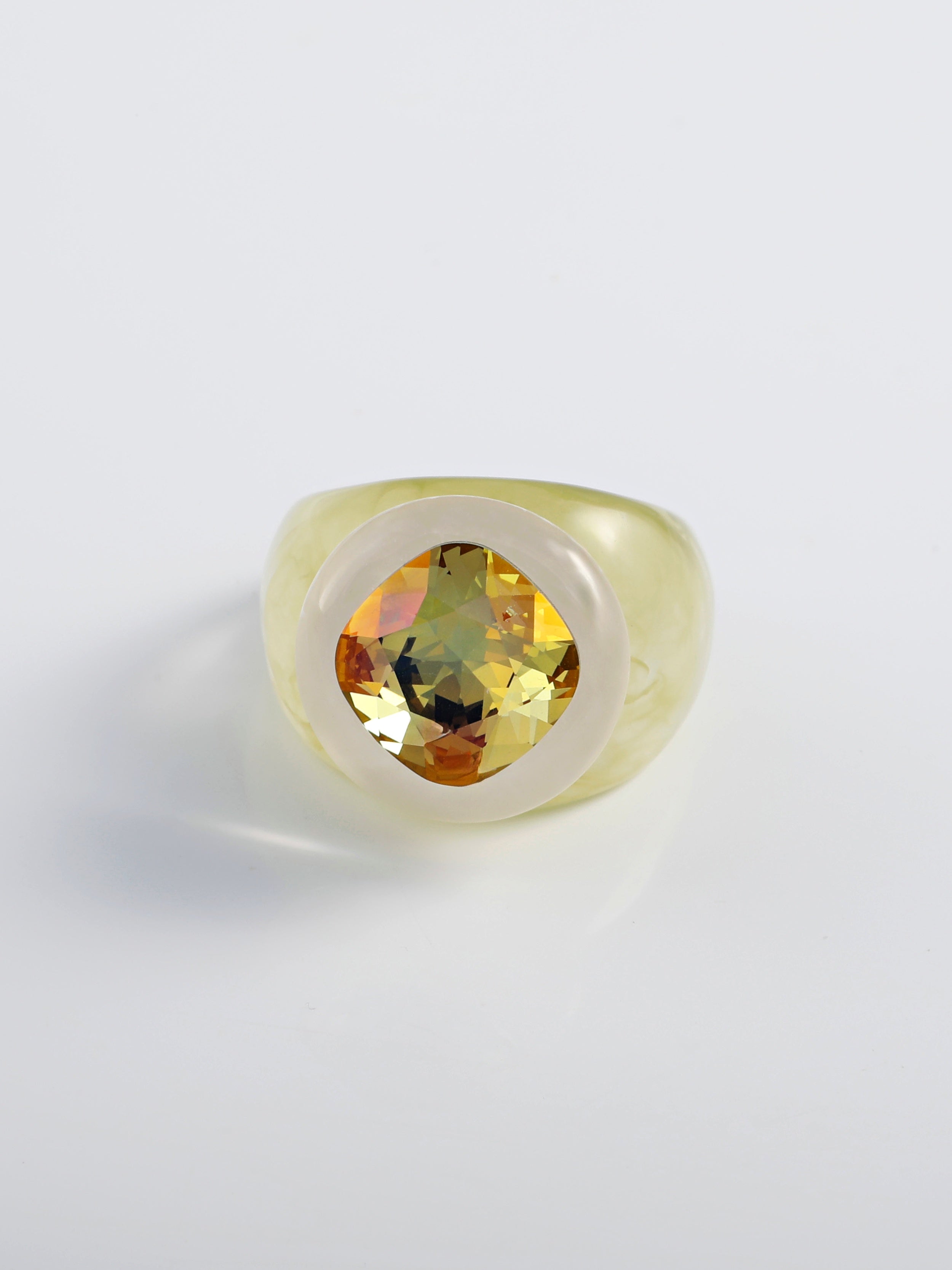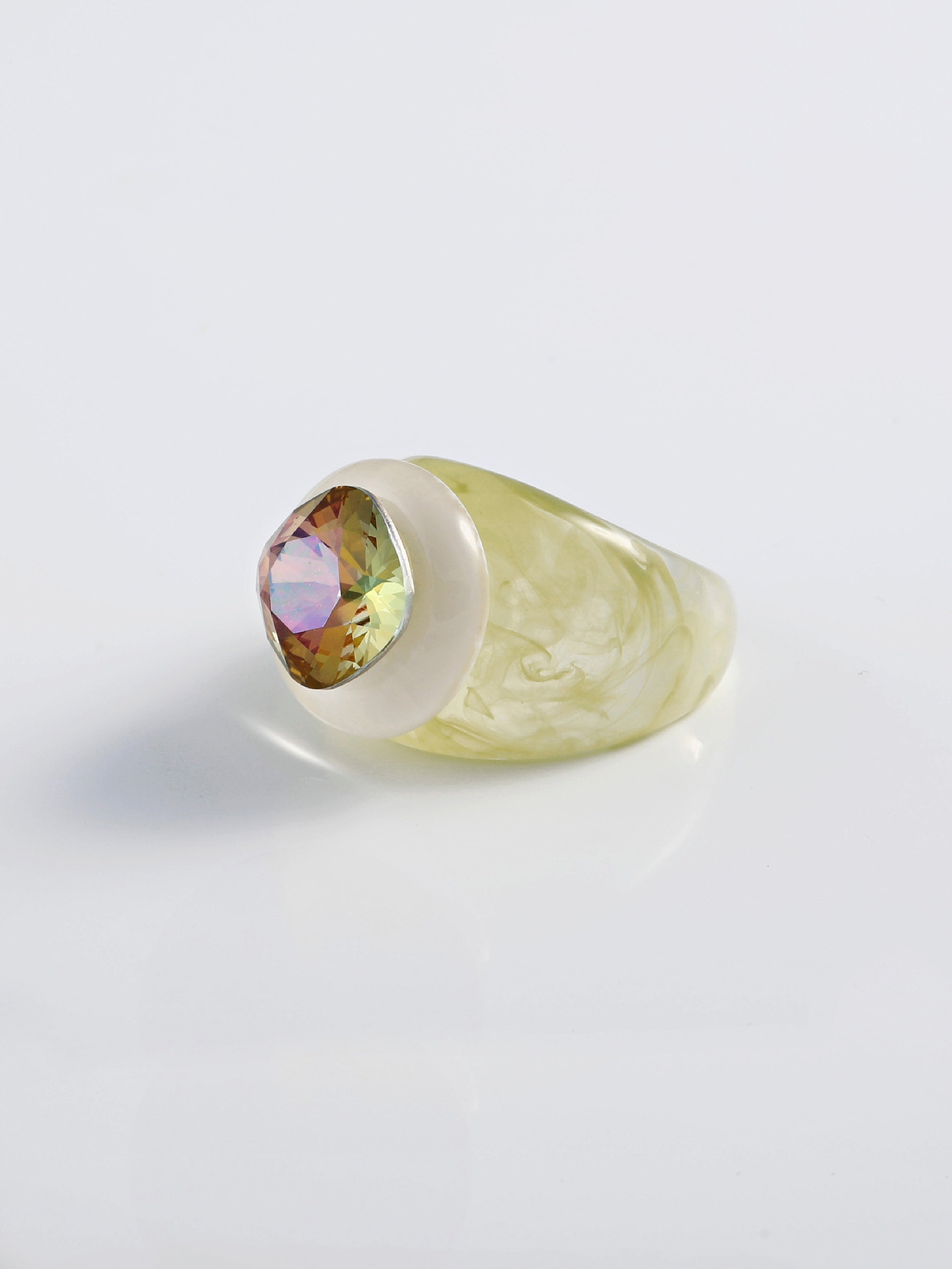 • Setless design featuring a floating iridescent yellow green cushion-cut Austrian crystal center stone.