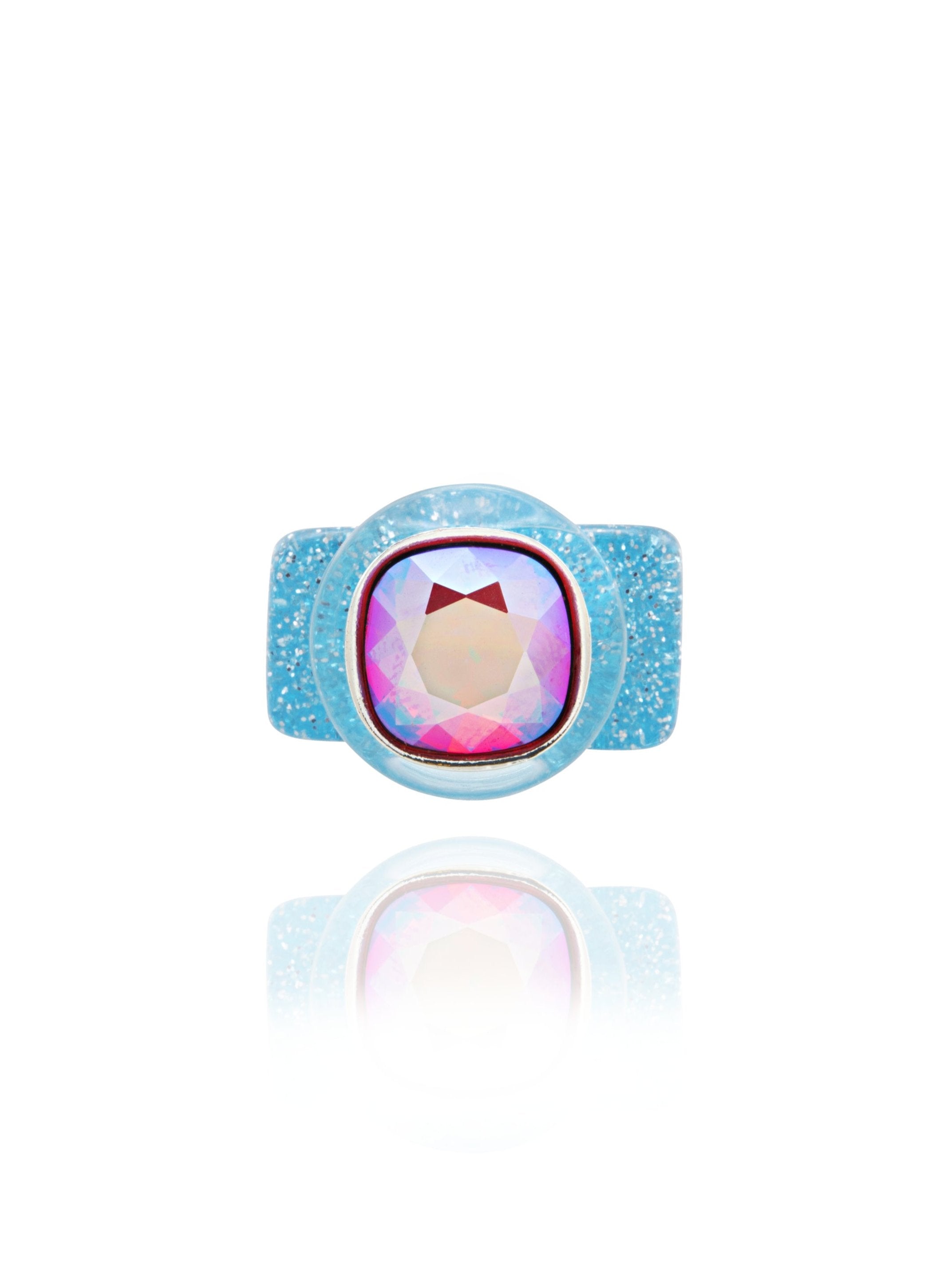 Inspired by rave culture, the Ring Pop Collection was designed to be light-catching and exuberant. Taking shape in sculptural form, the Ring Pop in Pool features a crystal rhinestone in a candy-saturated iridescent hue on an acrylic resin ring base. High-gloss color is anchored by crystalline brilliance, and each piece transforms a moment of nostalgia into refined adornment.