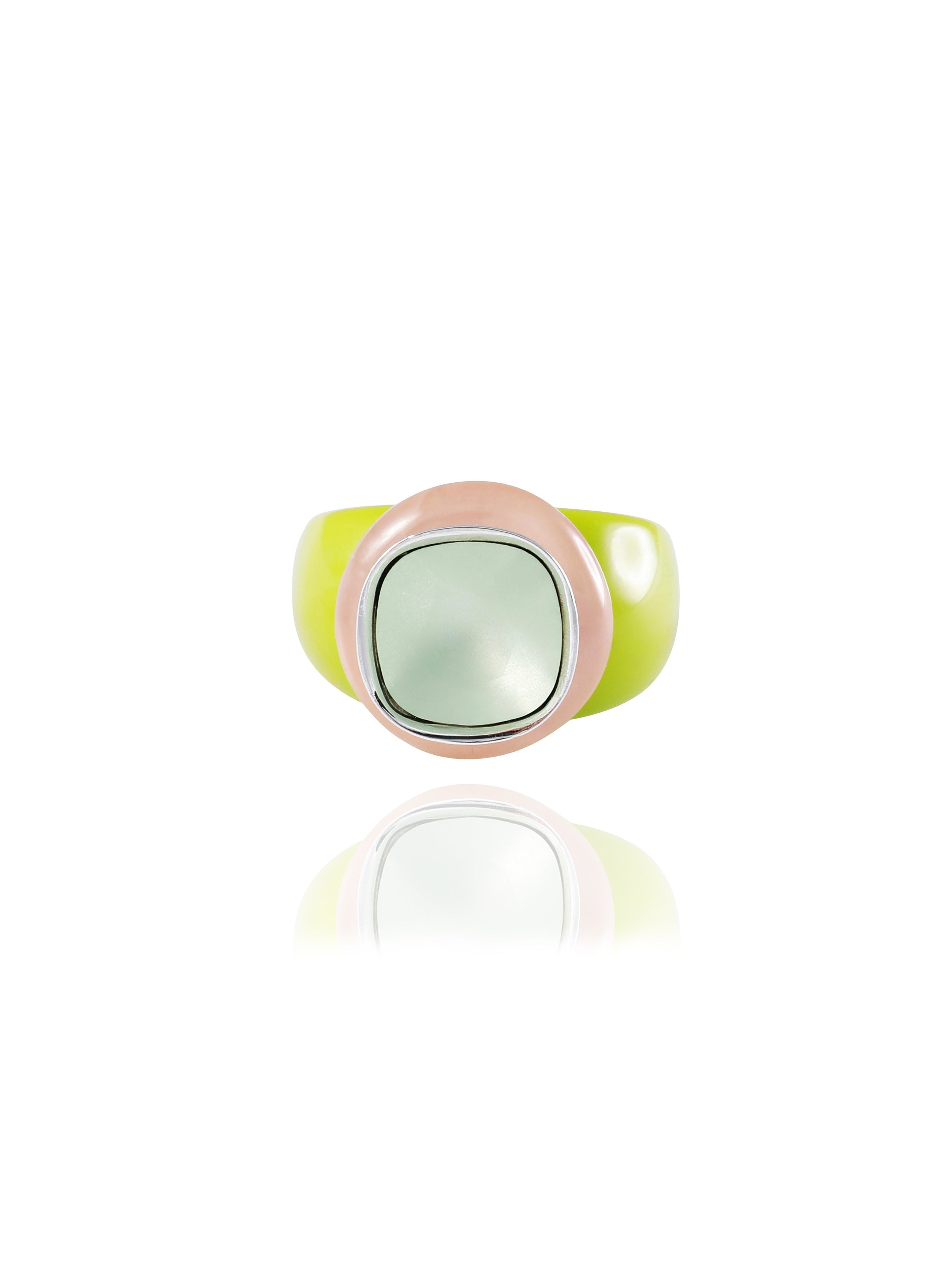 - Green hand-polished acrylic resin ring band with an opaque finish and pink accent.