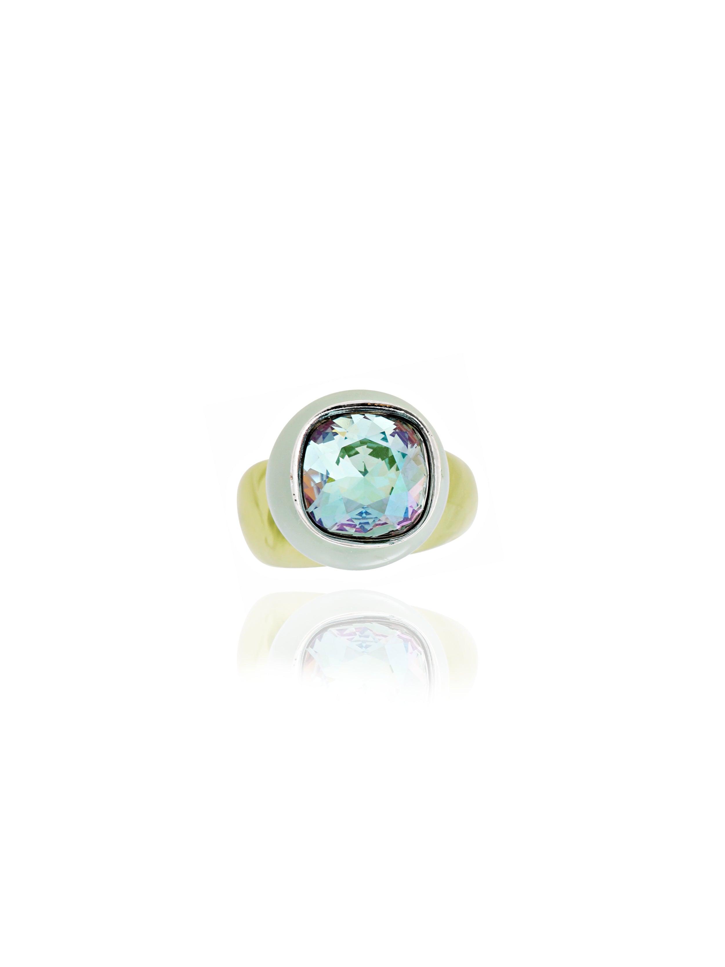 This sublime statement cocktail ring features punctuations of Austrian crystal and cubic zirconia rhinestones set upon a sculptural resin ring base. A second band is included of sheer colored acrylic for stacking.