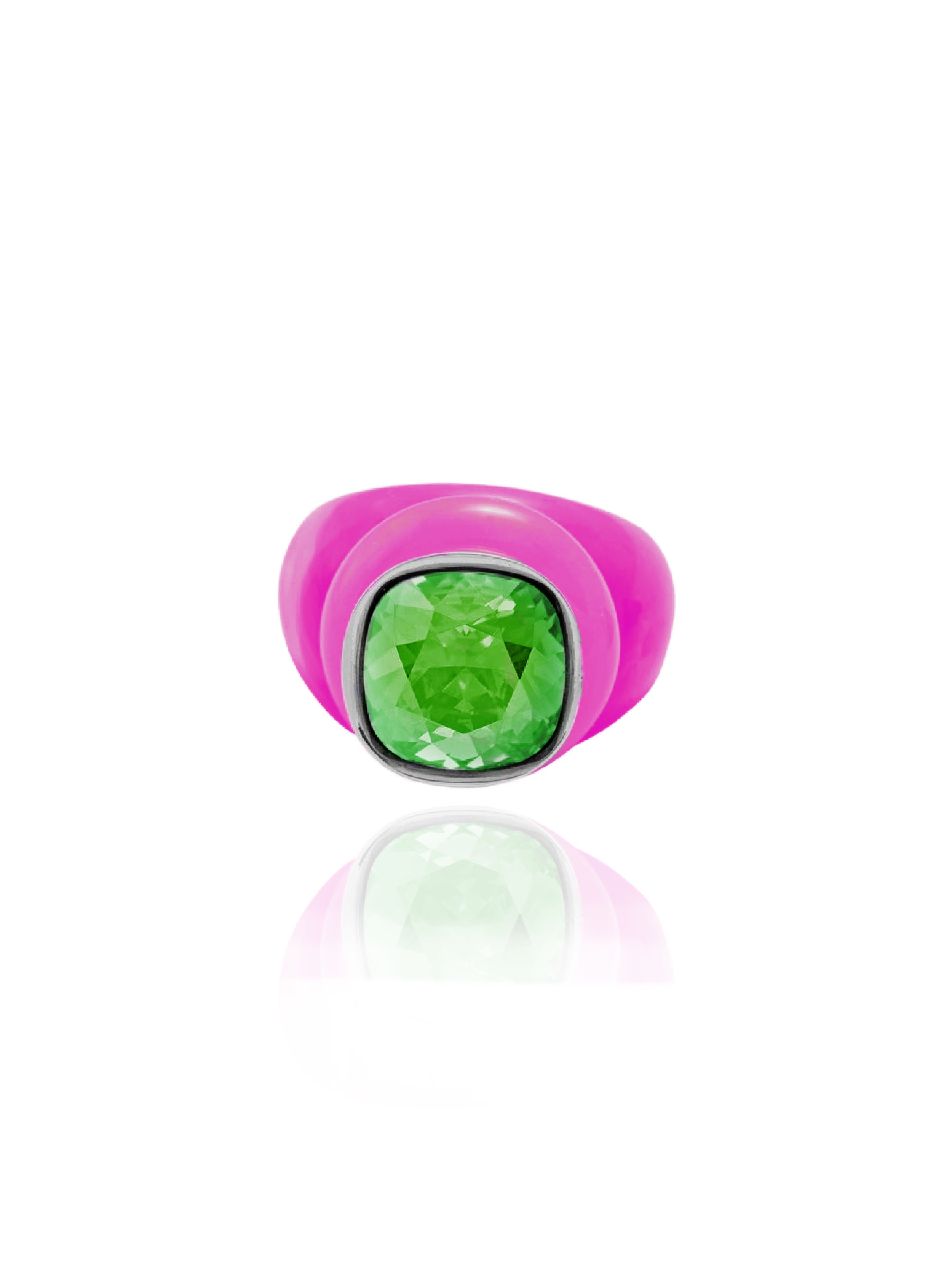 Inspired by rave culture, Ring Pops were designed to be light catching and exuberant. Taking shape in exaggerated dimensional forms, Ring Pops feature layers of crystal rhinestones and cubic zirconia elements in candy saturated iridescent hues on an acrylic ring base.
