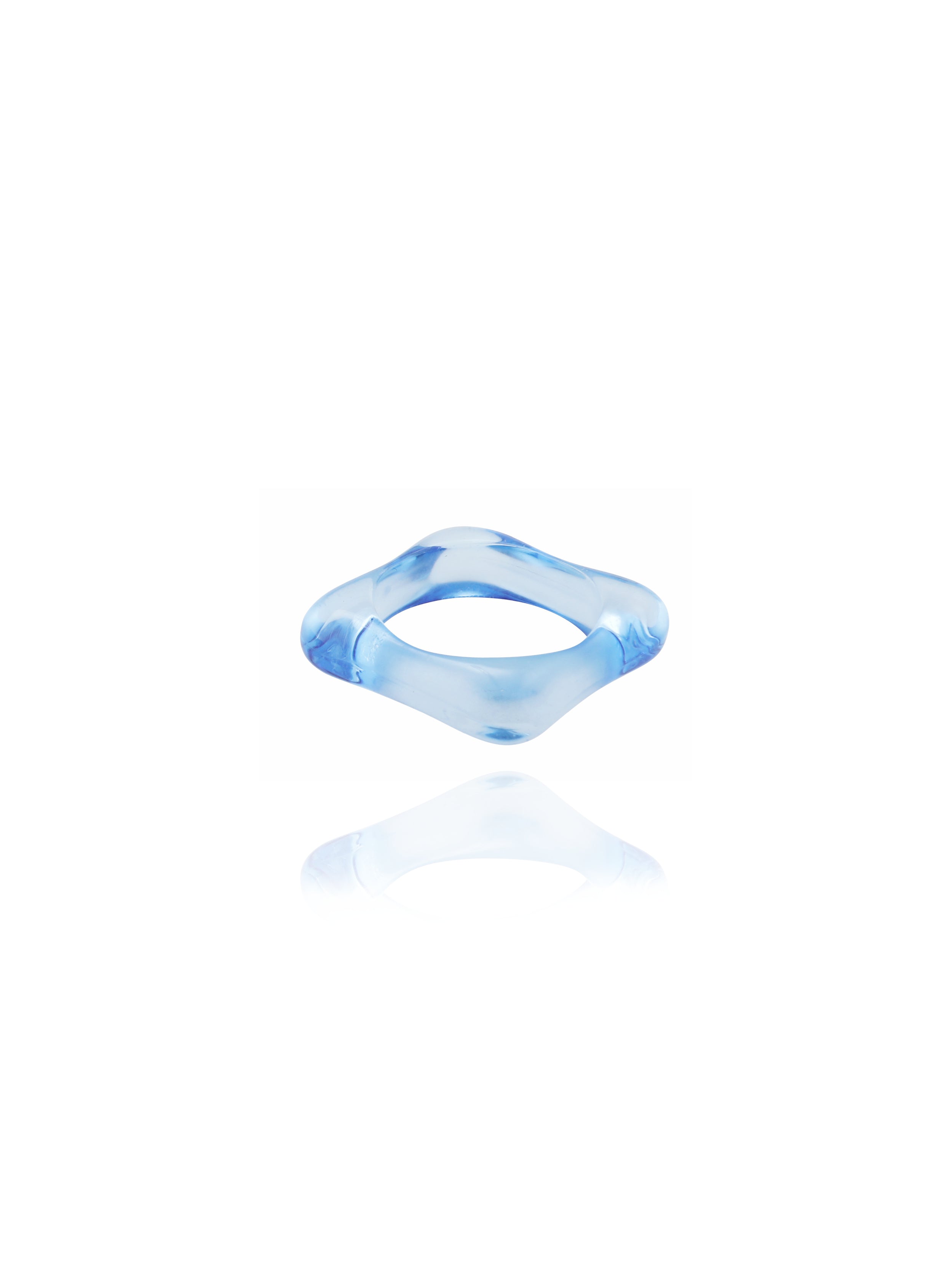 - Set also includes a thin free form band in blue acrylic with a translucent finish.