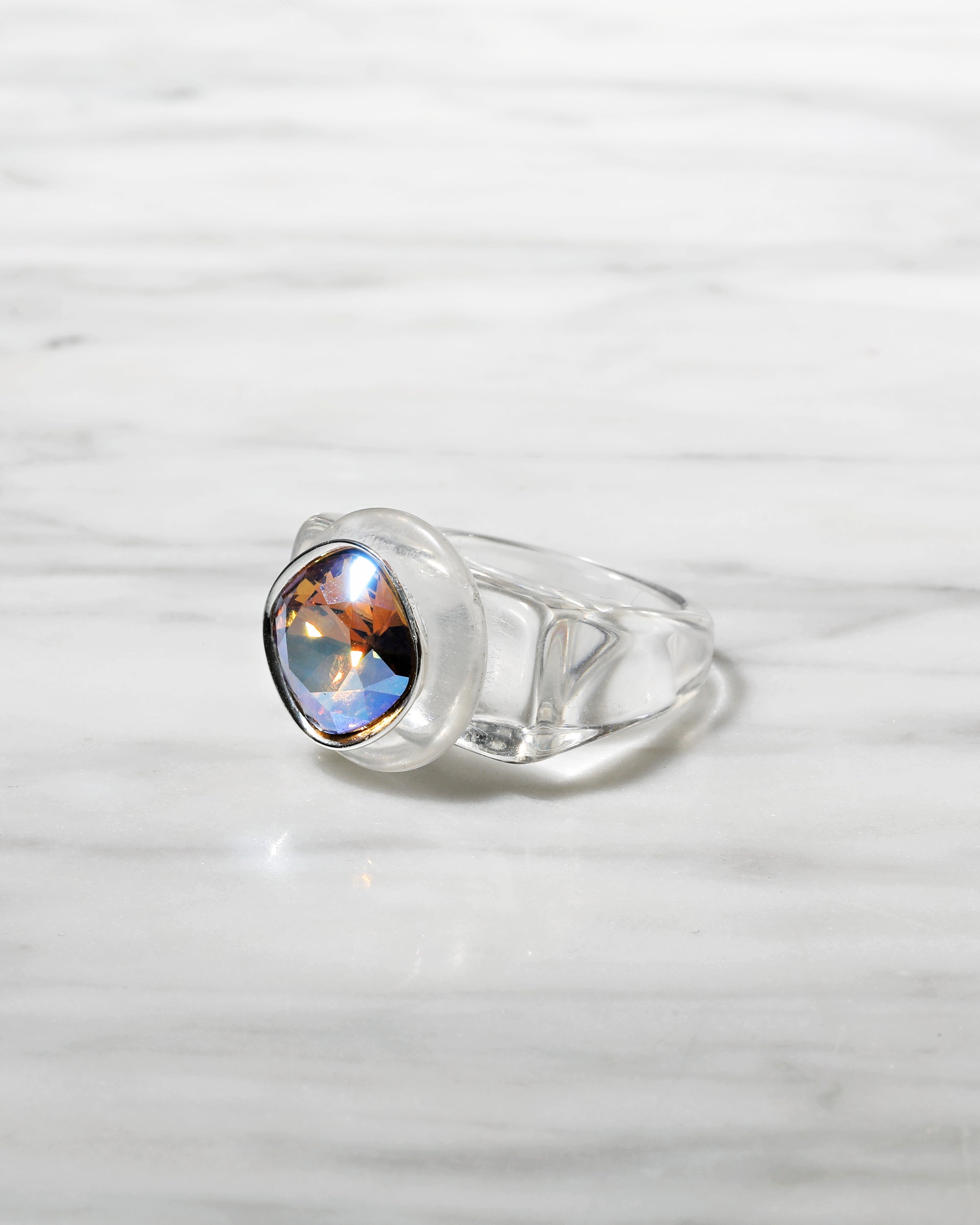 In line with our multi-colored Ring Pop, Daydream and Good Mood Ring collections, Spectrum Rings feature the same layered profile. Where they differ is in their tonality and focus on one hue, bringing dimension more dominantly through texture. A flush of singular color combines a richly hued acrylic band with the delicate complimenting sparkle of an Austrian crystal.